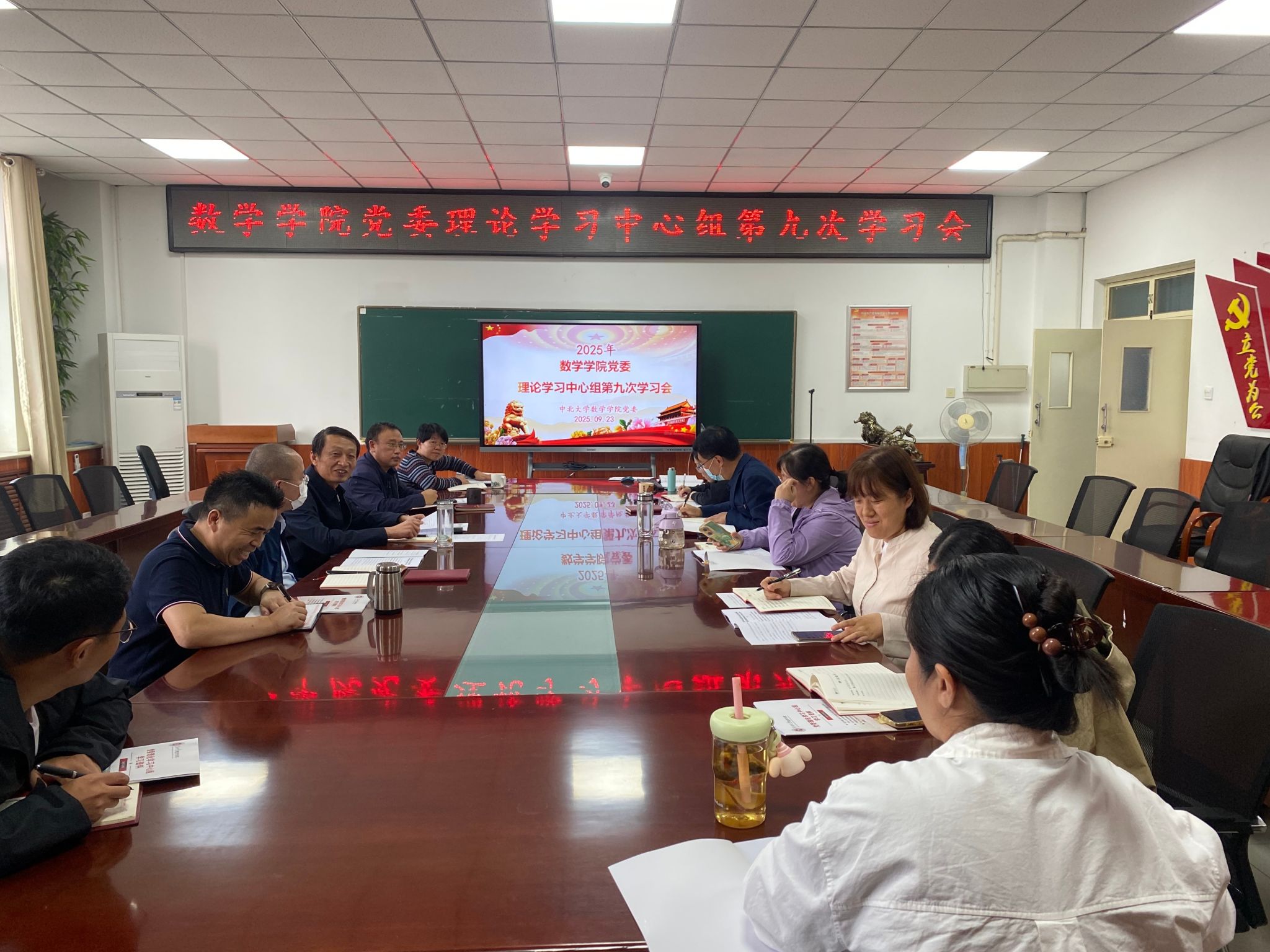 2025年9月23日下午,探花av 在9号楼六层会议室召开2025年党委理论学习中心组第九次集体学习会议。会议由党委书记薛亚奎同志主持,全体处级干部、党委委员、各党支部书记和教师代表参会。