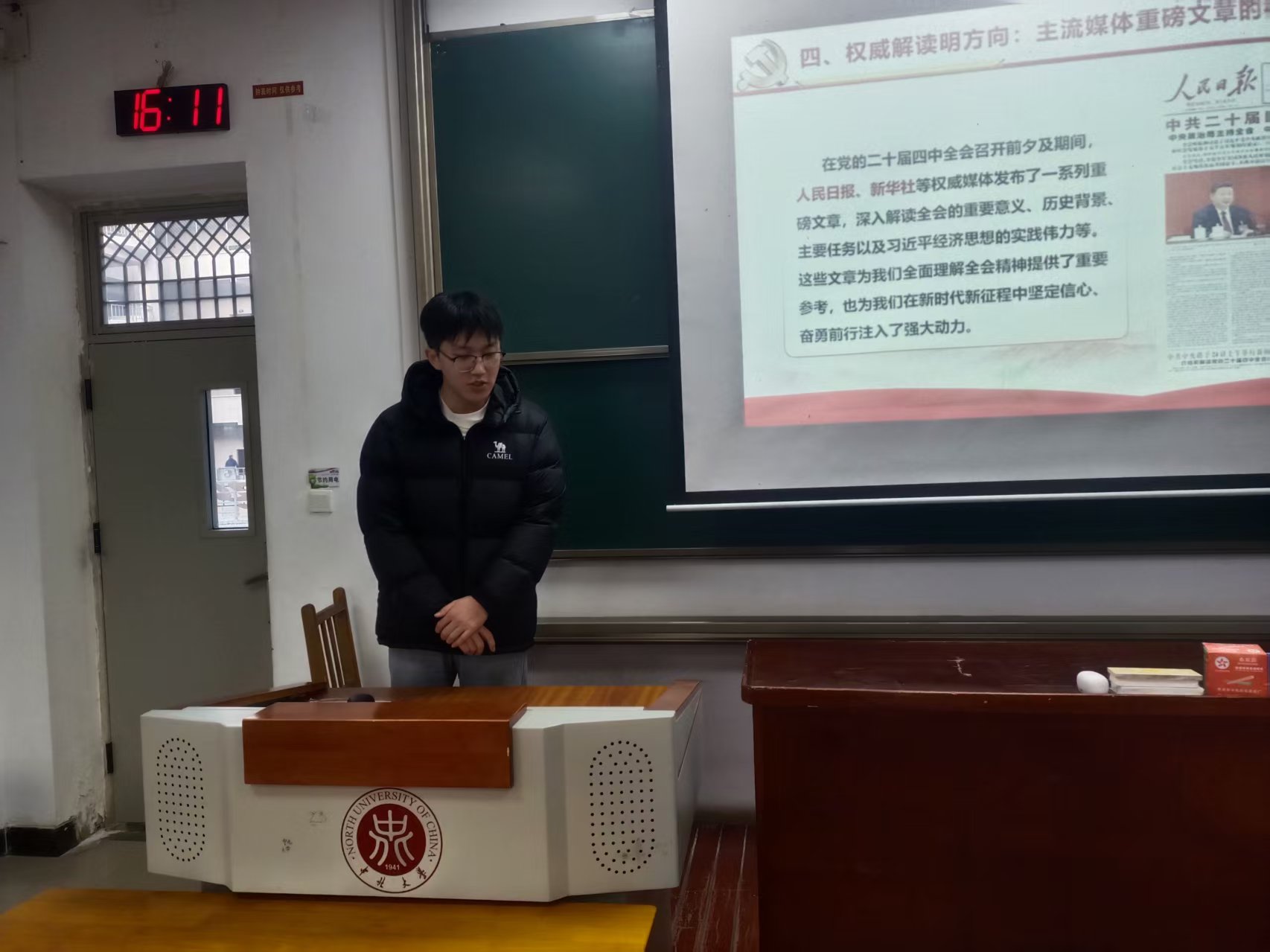 研究生党员韩亚龙、王秀华,以“解码二十届四中全会:青年视角下的中国式现代化新征程”为题进行导学,系统解读四中全会精神与“十五五”时期国家发展的整体性部署,重点阐述“加快发展新质生产力”“扎实推进共同富裕”“统筹高质量发展与高水平安全”等关键方向。讲解结合高校育人实际,突出教育、科技、人才一体化推进在“十五五”中的基础性作用,引导青年学子思考如何在国家战略需求中定位专业角色。讲解结合视听化展示与高校实际,使理论学习既有高度又接地气。