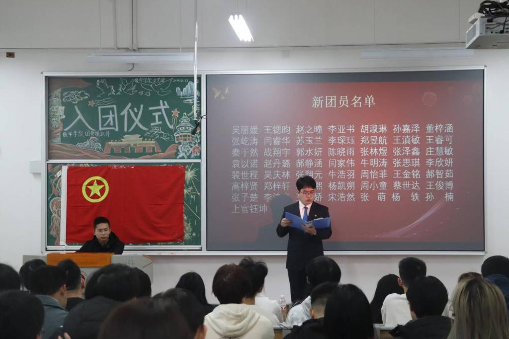 活动第二项,主持人宣读了新团员名单,此次共有 50 名优秀学生经过层层考验,光荣地加入了中国共产主义青年团。他们在学业上勤奋刻苦,在品德修养上追求卓越,在社会实践中积极奉献,充分展现了新时代青年学子的良好风貌。在热烈的掌声中,新团员代表们依次走上台,学生科于敏老师为他们颁发团员证和团徽。团徽熠熠生辉。这小小的团徽,不仅象征着一份沉甸甸的责任与使命,它将时刻提醒着新团员们,要以更高的标准要求自己,在思想和行动上都成为同学们的楷模。