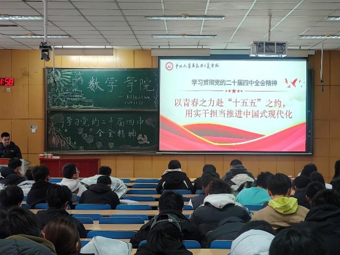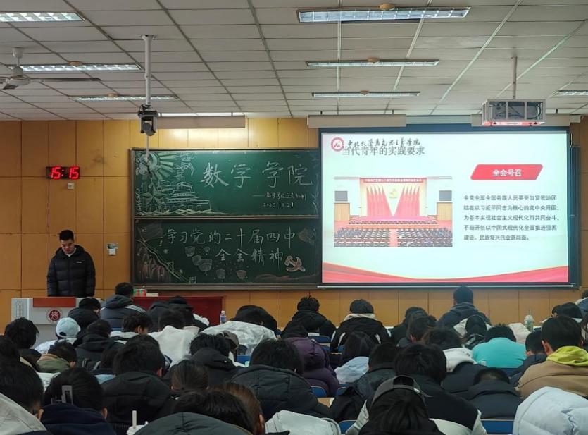 “学习党的二十届四中全会精神”的主题板报图文并茂,与投影幕布上的全会会场图片、“全党号召”等内容相呼应,让理论学习更具沉浸感。现场学子认真聆听,不时记录要点,不少同学在互动环节分享感悟,表示“要把全会精神转化为学习动力,用专业知识服务国家发展”。