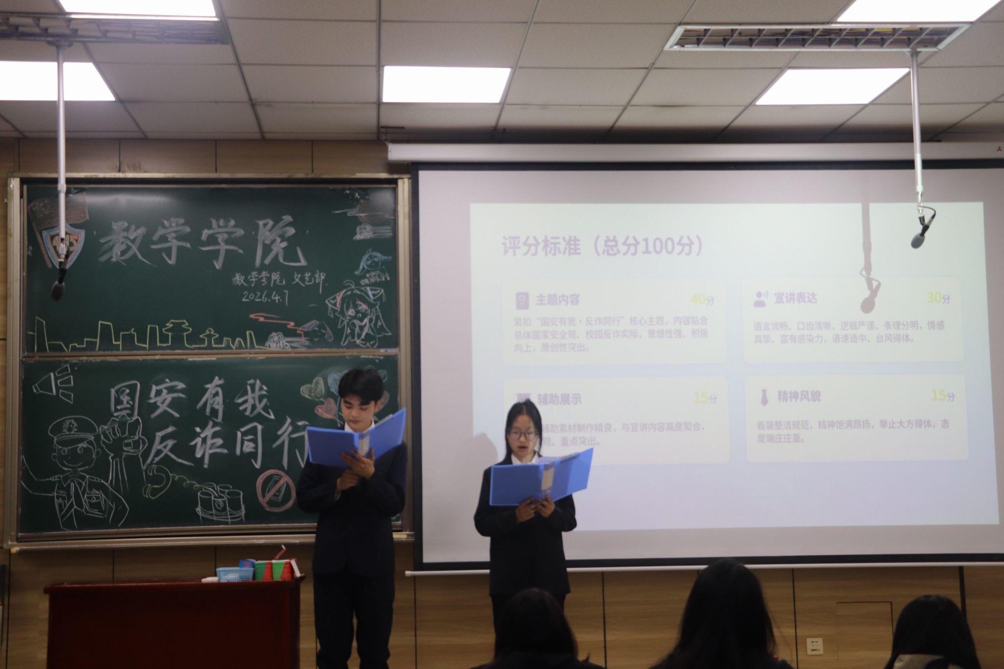 本次宣讲大赛围绕“国安有我·反诈同行”核心主题展开,设置主题内容、宣讲表达、辅助展示、精神风貌四大评分维度,总分100分,由评委打分取平均分作为选手最终成绩。比赛正式开始前,主持人详细介绍了赛事评分标准与宣讲流程,明确宣讲时长控制在5分钟,超时将酌情扣分,确保赛事公平有序推进。