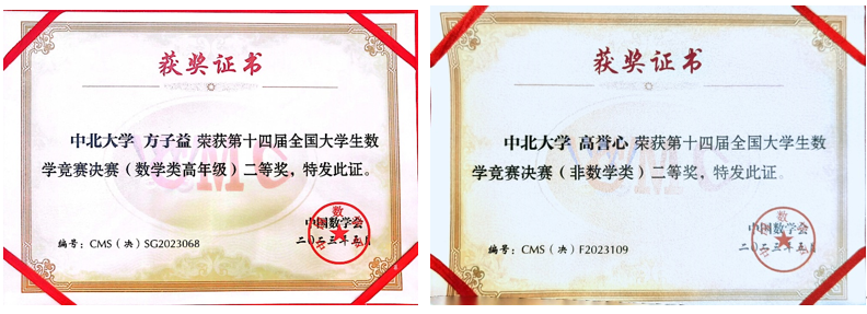 方子益同学在数学类(高年级组)全国二等奖中排名第七,山西省排名第一,仪器与电子学院高誉心同学在非数学类全国二等奖中排名第十三,山西省排名第一。