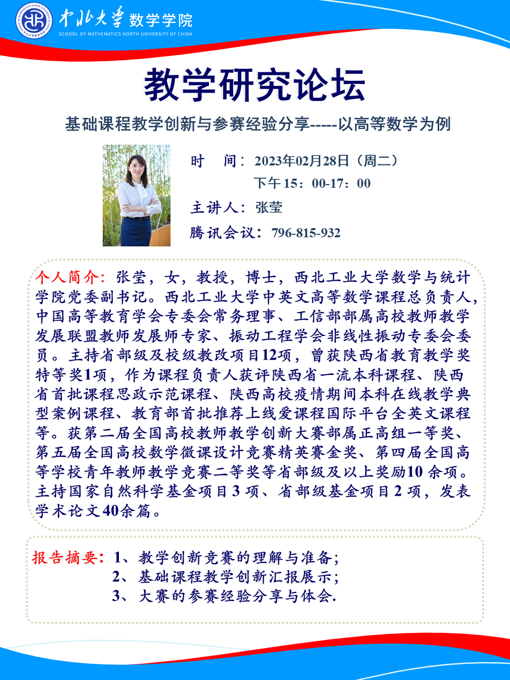 特邀全国高校教师教学创新大赛一等奖获得者、西北工业大学张莹教授,做了题为“基础课程教学创新与参赛经验分享——以高等数学为例”的教学创新报告。本次论坛在九号楼918线上线下同步进行,学院领导和全体教师参加了讨论学习。论坛由副院长王鹏教授主持。